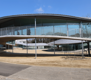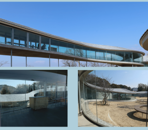 真っ青に晴れわたった小高い丘の広場を囲む美しいガラスの蛇行曲線は、近代的でありながら周りの自然を優しく抱き、ずっと前からそこにあったように溶け込んでおりました。