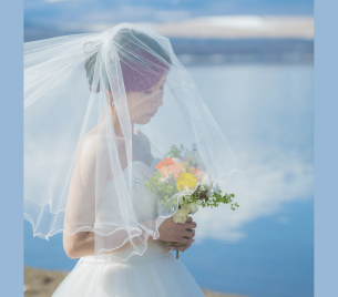 純白ドレス姿の新婦様とライトブルータキシードの新郎様が