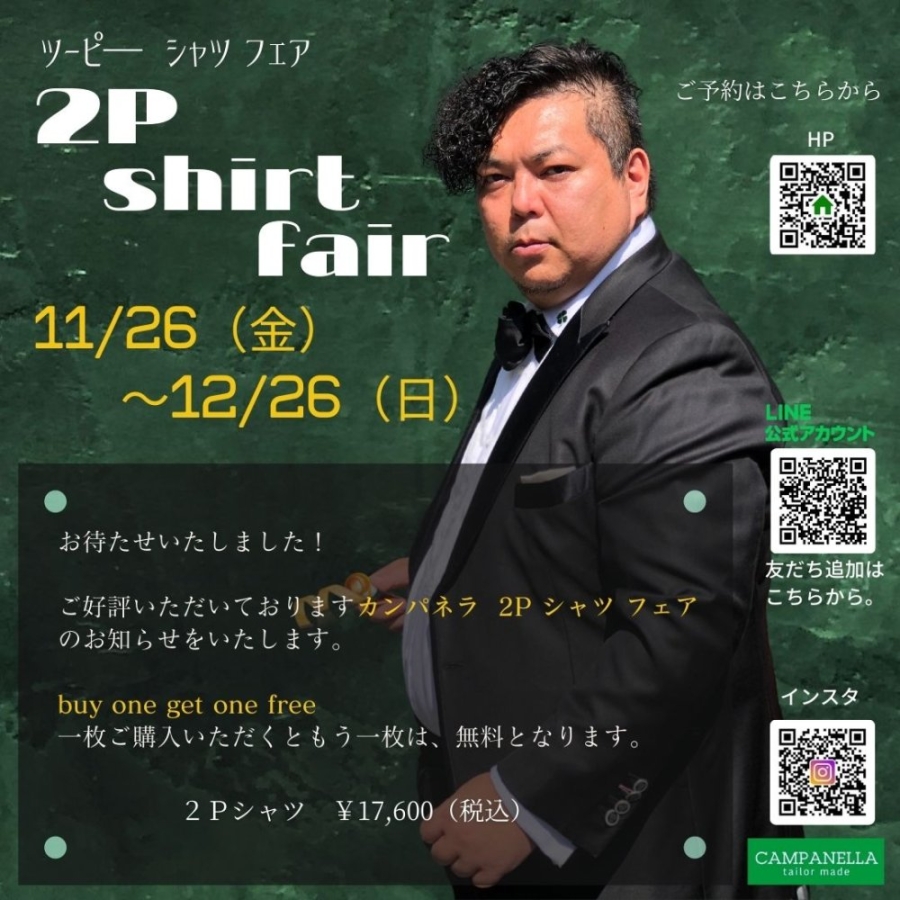 毎回人気を博しておりますオーダーシャツの2Pフェアが始まりました。